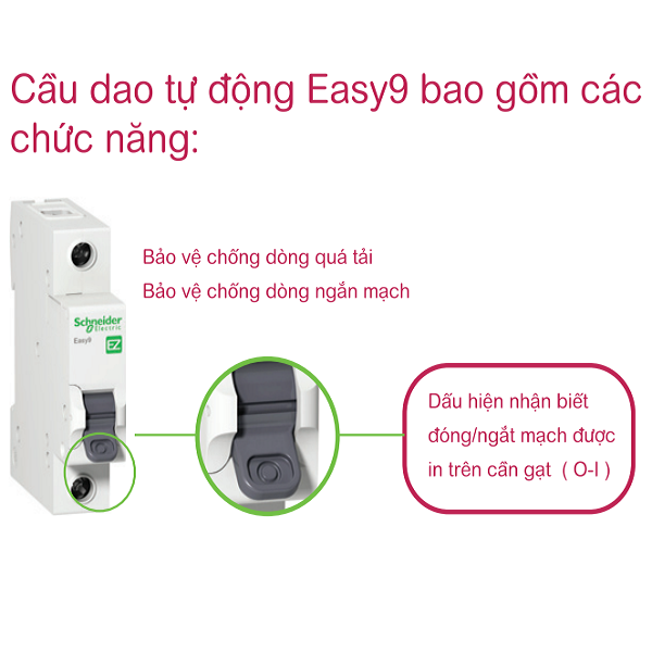 MCB Easy9 Schneider được sản xuất theo tiêu chuẩn IEC 898, sử dụng đường cong đặc tính loại C, cho khả năng ngắt mạch nhanh, chính xác khi xảy ra sự cố. Thiết bị có khả năng chịu dòng cắt 4.5kA, điện áp định mức 230V, đáp ứng tốt các yêu cầu bảo vệ cơ bản trong hệ thống điện hạ thế.
